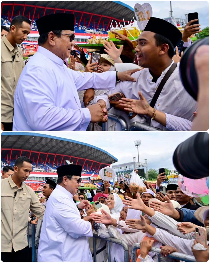 Disambut ratusan ribu jemaah NU yang telah memadati stadion sejak malam hari, Presiden tampak menyapa peserta dan mengapresiasi suasana khidmat yang tercipta.