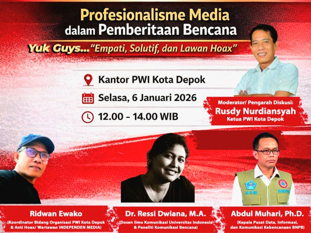 “Agenda diskusi nasional ini merupakan wujud kepedulian PWI Depok terhadap krisis kemanusian yang terjadi jika antisipasi dan penanganan pascabencana tak berjalan sebagaimana mestinya. Nah, pemberitaan pers turut menentukan kondisi tersebut, khususnya dalam menangkal gelombang hoaks di platform media sosial khususnya,” kata Rusdy kepada wartawan di Kota Depok, Sabtu (3/1/2026).