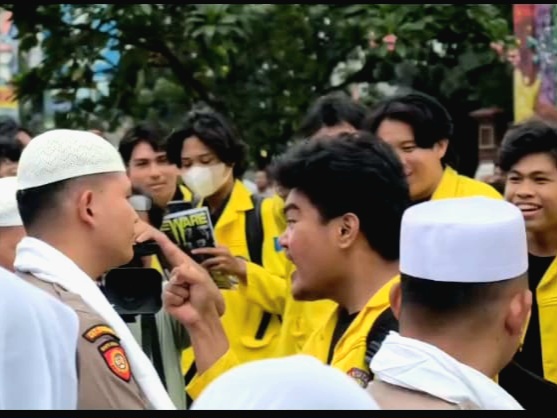 Anggota kepolisian yang berada di lokasi mengenakan peci berwarna putih di kepalanya lengkap dengan serban putih yang dikalungkan di bagian leher.