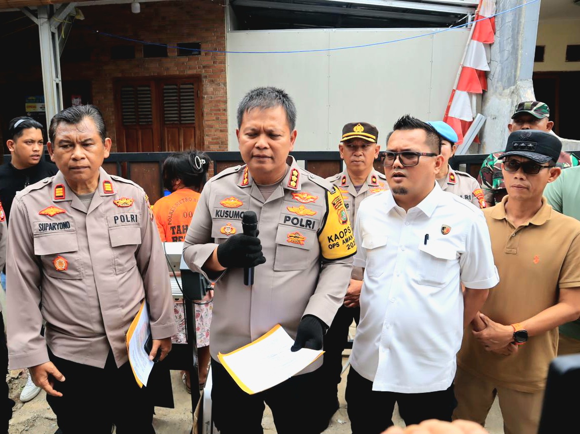 Press Conference dipimpin Kapolres Metro Bekasi Kota Kombes Pol Kusumo Wahyu Bintoro di lokasi kejadian: Kavling Carolus, Jalan Kampung Sawah, Kelurahan Jatimurni, Kecamatan Pondok Melati, Kota Bekasi.