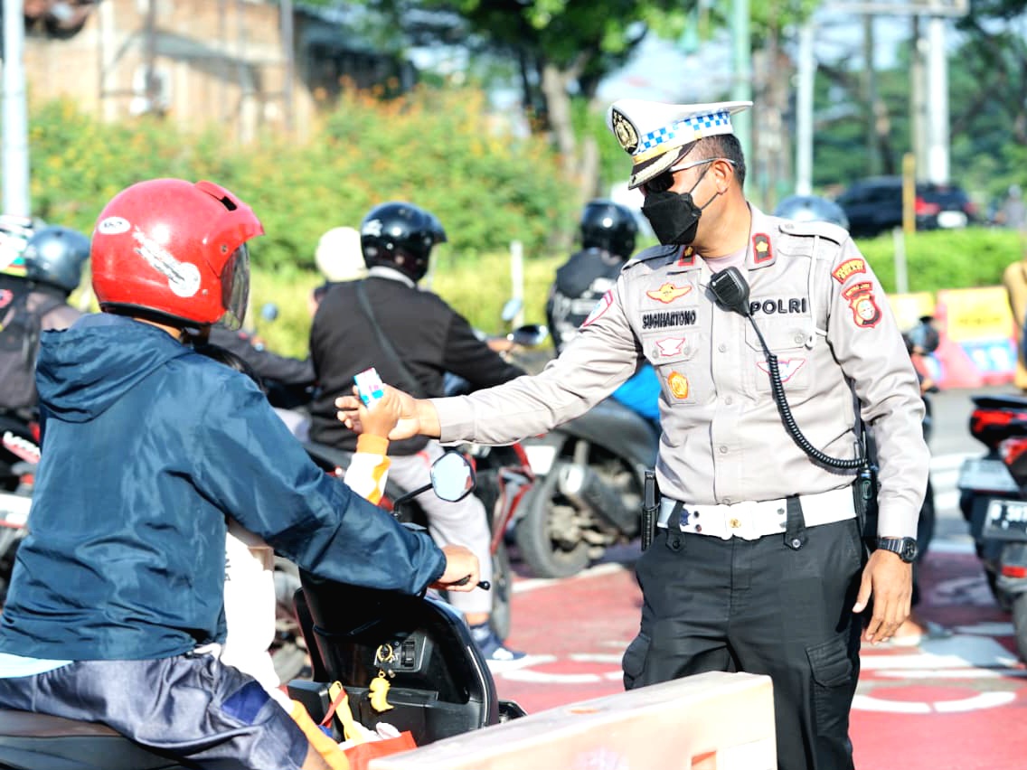 Petugas tidak hanya mengurai antrean kendaraan dan membantu penyeberangan masyarakat, tetapi juga melakukan edukasi langsung tentang disiplin berlalu lintas kepada pengendara.