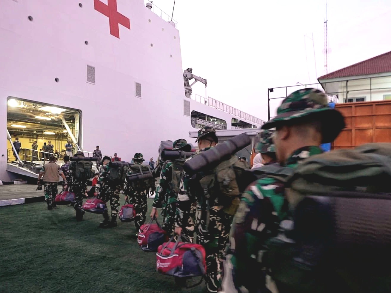 Setelah menerima pengarahan, tim satgas melaksanakan embarkasi menuju KRI dr. Radjiman Wedyodiningrat-992 di Kolinlamil sebelum berlayar ke wilayah terdampak. ●Redaksi/Alia