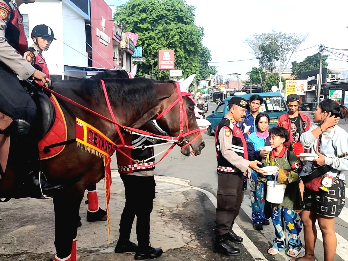 HARIAN PELITA — Pasukan Berkuda (Turangga) Direktorat Polisi Satwa (Ditpolsatwa) Korsabhara Baharkam Polri melaksanakan kegiatan Patroli Jumat Berkah di Jalan Raya Komjen Pol M.Jasin, Kelapadua, Depok pada Jumat (24/10/2025) pagi pukul 07.00 WIB.