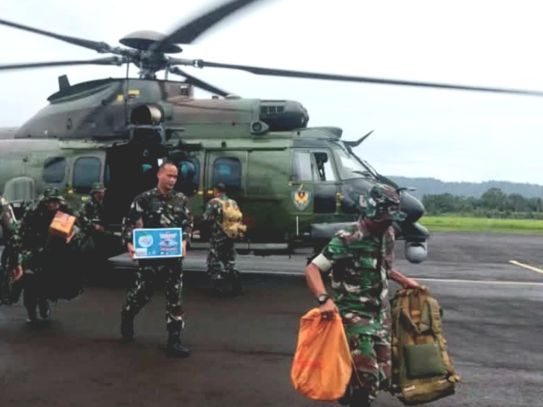 Helikopter berhasil mengangkut 2.200 kilogram logistik dlm dua sortie penerbangan menuju sejumlah titik terdampak.