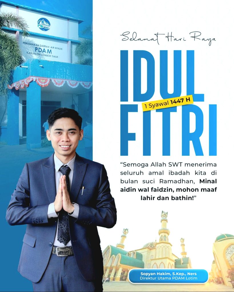HARIAN PELITA — Menyambut Hari Raya Idul Fitri 1 Syawal 1447 Hijriah, Direktur Utama PDAM Kabupaten Lombok Timur, Sopyan Hakim menyampaikan ucapan selamat deluruh masyarakat Lombok Timur.