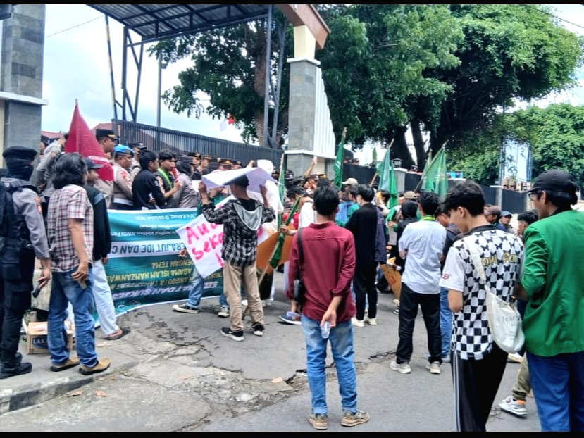 HARIAN PELITA — Puluhan massa aksi tergabung dalam Aliansi Pemuda dan Masyarakat Lombok Timur Menggugat mendatangi kantor Kepolisian Resort (Polres) setempat, Rabu 3 Desember 2025.