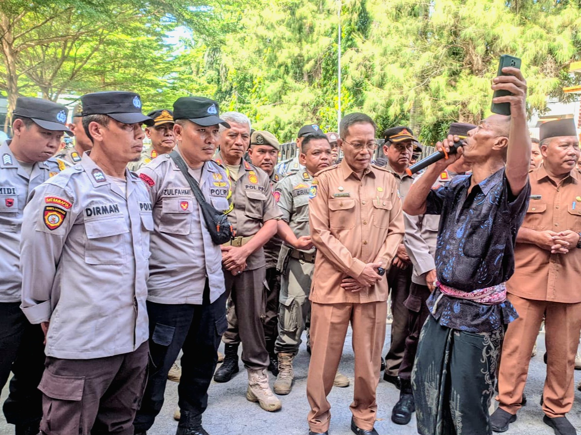 Menjawab tuntutan masa aksi, Sekretaris Daerah H Juaini Taufik didampingi Jasat Pol PP Salamun Rahman dan Kepala Bakesbangpoldagri Kabupaten Lombok Timur Mustafa menyampaikan bahwa Bupati Lotim tidak bisa menemui massa aksi karena sedang mengikuti Rapat terkait menjadi permasalahan Lombok Timur. ●Redaksi/LR