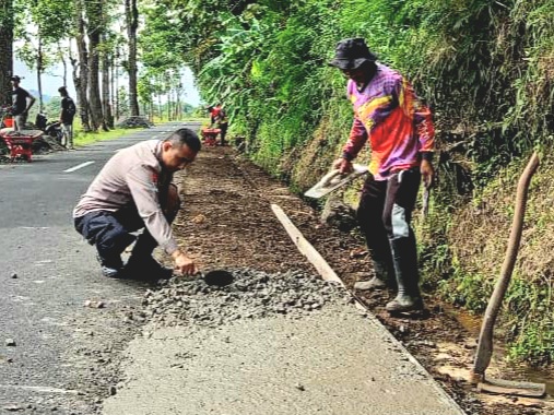 Pada kesempatan itu (Bhabinkamtibmas) Desa Sukamaju Aipda Kartoyo meninjau langsung pelaksanaan kegiatan Rabat Beton bahu jalan untuk ikut serta mengawal pekerjaan agar berjalan dengan lancar. ●Redaksi/Lili