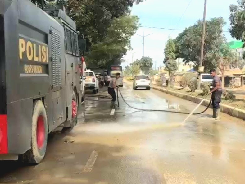 Menyikapi kondisi tersebut, Polri melaksanakan pembersihan serta penyiraman jalan protokol di Kabupaten Aceh Tamiang, Kamis (25/12/2025).