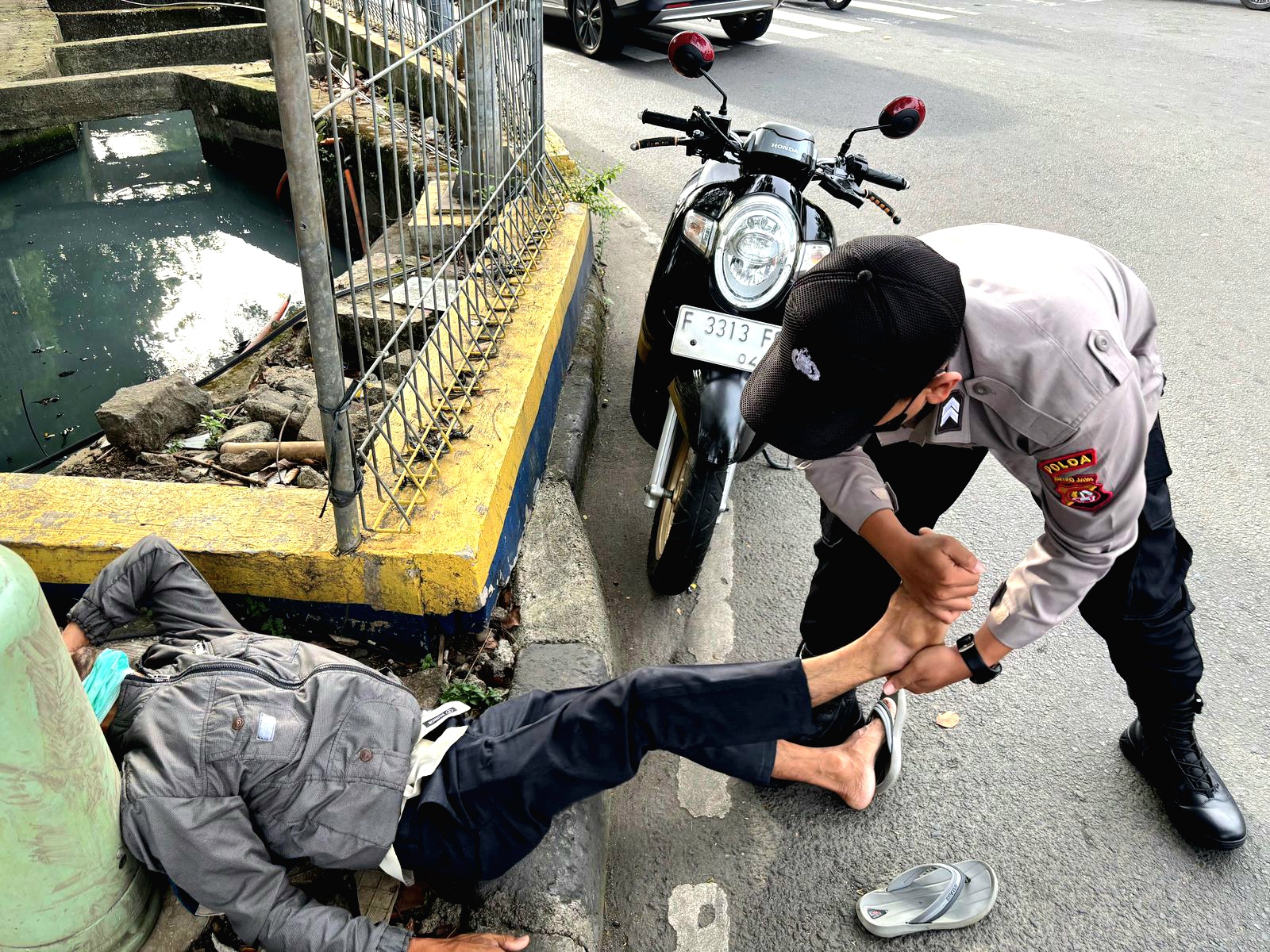 Korban yang tergeletak di pinggir jalan tampak kesakitan pada pergelangan kakinya. Seorang anggota polisi berseragam lengkap yang diketahui bernama Briptu Beny dari kesatuan Bidhumas Polda Metro Jaya tersebut segera mendekat, membungkuk, dan dengan hati-hati memberikan penanganan awal pada kaki yang cedera tersebut.