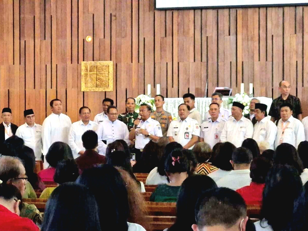 Di hadapan ribuan jemaat yang memadati ruang ibadah, Munjirin menyampaikan ucapan selamat Natal serta menegaskan komitmen pemerintah daerah bersama aparat keamanan dan masyarakat dalam menjaga kondusivitas selama perayaan berlangsung.