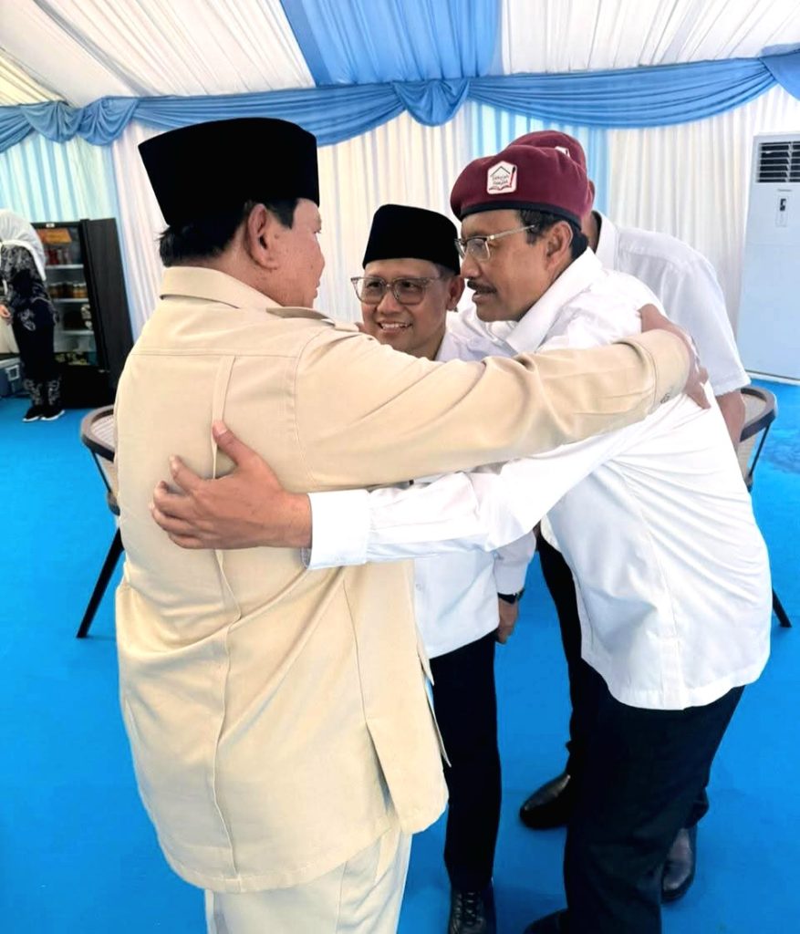 Para hadirin pun ikut hanyut dalam sambutan akhir Gus Ipul. Gus Ipul turun dari panggung. Tepat di depan Prabowo duduk, ia membungkukkan badan sekali lagi. Prabowo berdiri dari kursinya dan menyambut Gus Ipul dengan pelukan. ●Redaksi/09