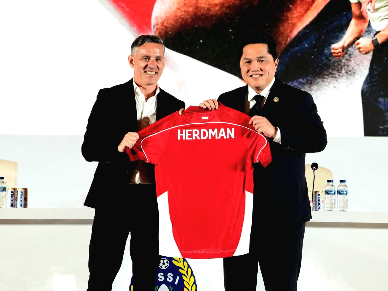 HARIAN PELITA — Pelatih Timnas Indonesia John Herdman diperkenalkan kepada masyarakat Hotel Mulia Senayan, pada Selasa (13/1) pagi oleh Ketua Umum PSSI Erick Thohir beserta dua wakilnya, Zainudin Amali dan Ratu Tisha Destria.